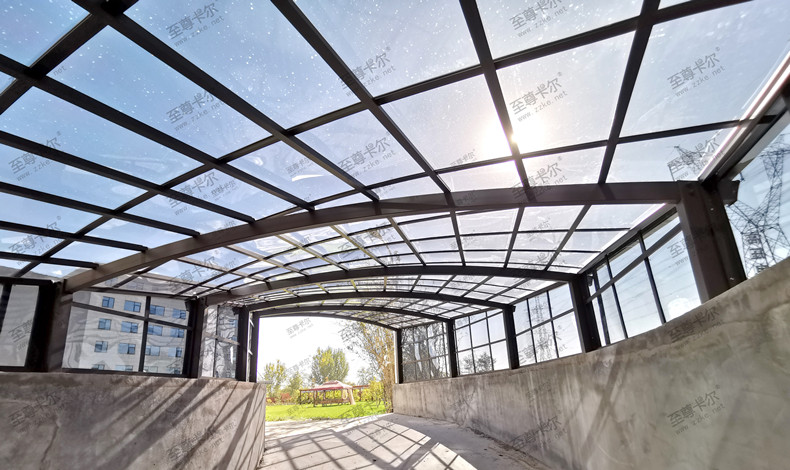 鋼化玻璃小編是不推薦的,因為頂棚玻璃易脆、易碎、危險系數(shù)比較高,骨架還易生銹,后期維護(hù)成本很高;陽光板頂棚易老化變黃、頂棚脆化、使用壽命較短,日常累積灰塵形成泥垢、斑駁的痕跡,透光性變差還極其影響美觀。但是耐力板地下停車庫出入口雨棚完全沒有這方面的問題。
